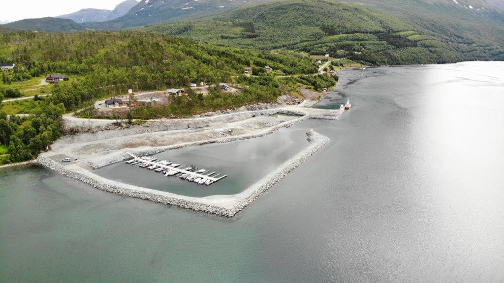 Bilde av den topp moderne moloen og området under utvikling. Korte avstander både fra Målselv Fjellandsby, Olsborg i Målselv, Storsteinnes og båteiere i Nordfjord, Lanes, Hamnvåg, Staff Camping, Aursfjord og Keianes.